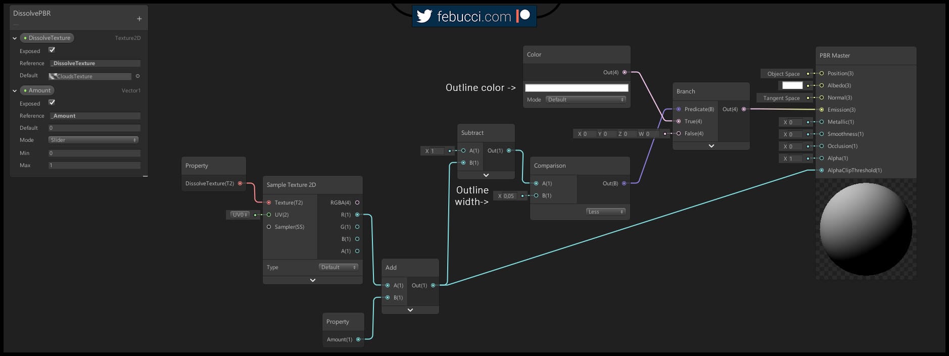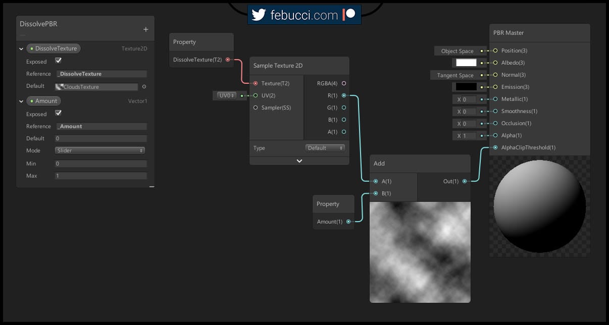 We sample our dissolve texture and get the red value, then add it to our Amount value (which is a property I created that represents the overall progress, 1=full dissolve) and connect it to the AlphaClipThreshold.