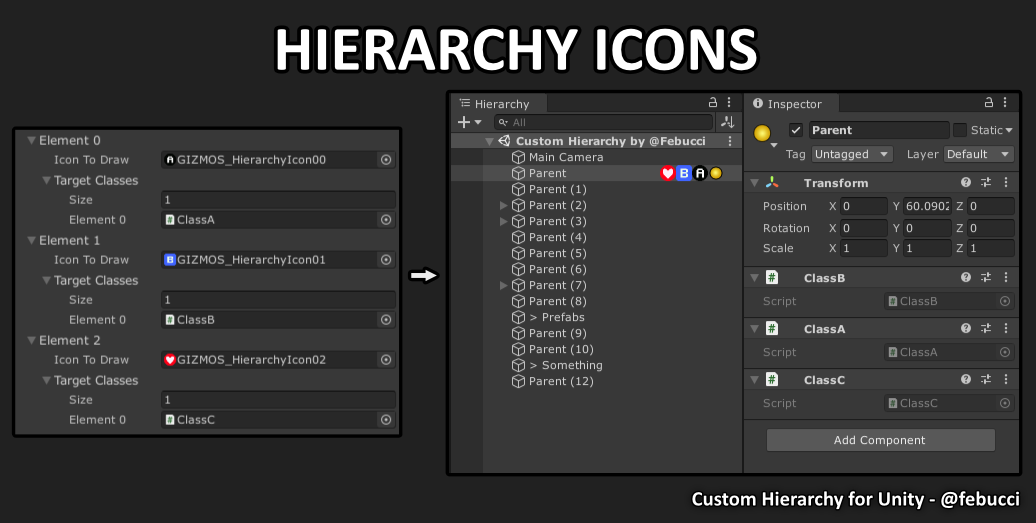 This was the main reason I created this plugin. I have a lot of different components on a lot of different gameObjects, and I reeeally got lost in the hierarchy most of the time. Example: with this plugin now, I can set up an icon for all the classes that inherit from my abstract "SceneTrigger" class, and instantly visualize all the other game triggers in the hierarchy.
