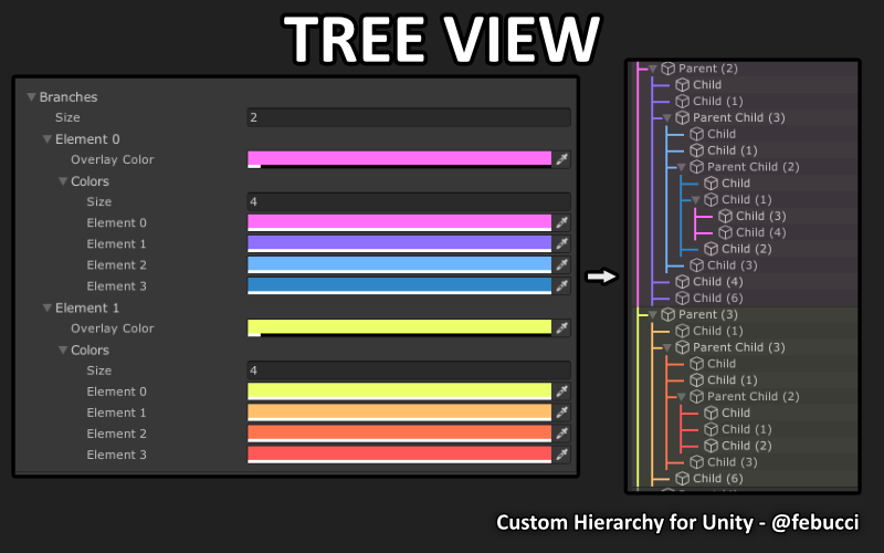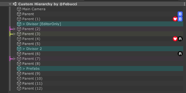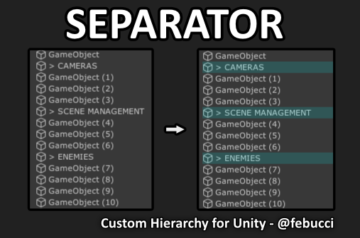 Hi, I'm Febucci and I've created this package to help having a clearer Hierarchy in Unity, organizing everything in a "tree view" and including extra informations like Components Icons and groups/divisors. It comes with 4 main features: tree view, component icons, separators and alternating lines.