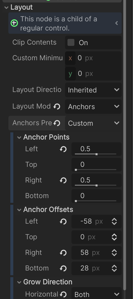 Note: Godot used to mention "margins" up until version 4.3, but they're now referred to "Anchor Offset". We didn't mention them yet to introduce things more clearly, but just know that you can decide precisely how many pixels you want a control node to "stay away" (or closer) to its container, when resizing dynamically. This value is relative to the anchors ("fixed" vs "fill etc."), and it's set for you automatically when you use the icons/templates we talked above.