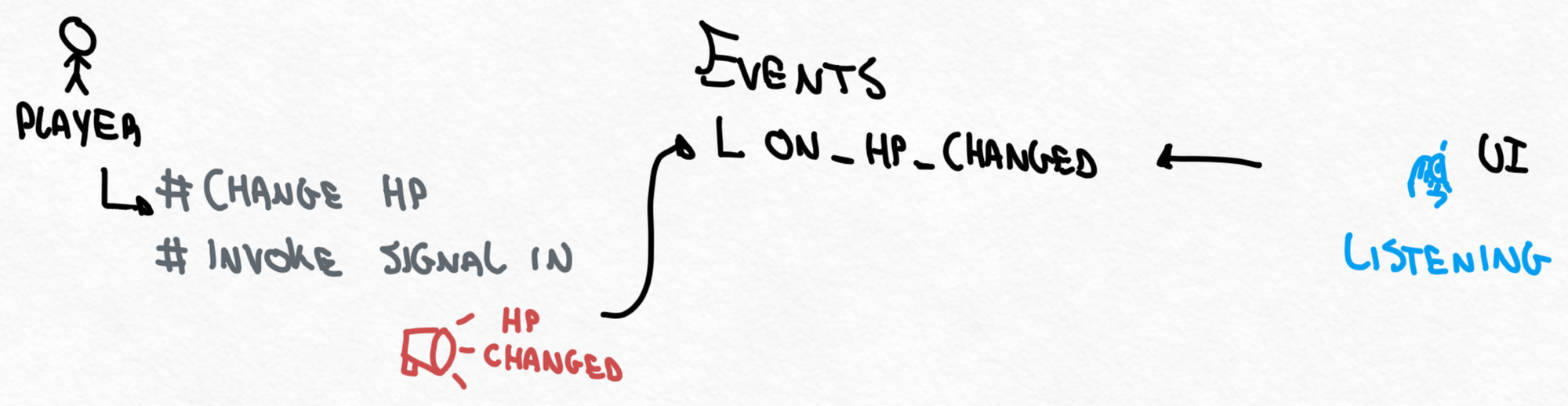 To make our game elements communicate with each other, like updating an health bar when the player gets hit (and almost any other interaction), we can have a look at a signaling/events system.