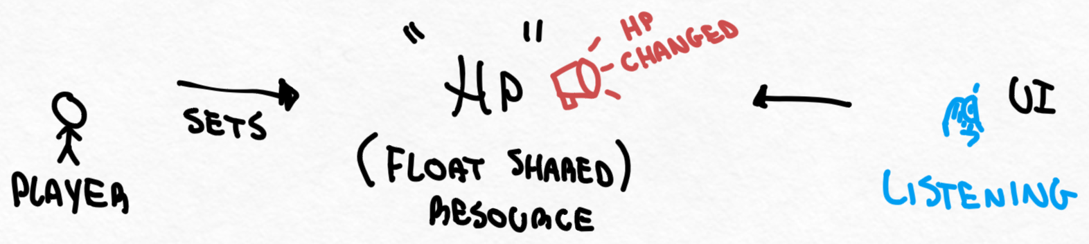 Resources that expose an on_changed signal and store a value. Both the setter (e.g. player) and listeners (e.g. health bar) reference the same resource, keeping them independent from each other.